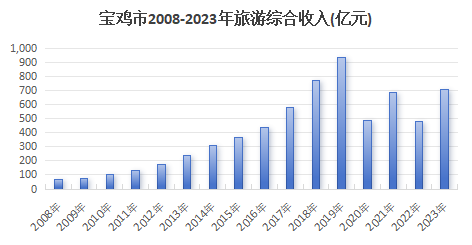 文旅市场消费潜力不断释放。新中国成立75年来,文化产业不仅为宝鸡经济社会发展贡献了重要力量,还带动文化旅游业、文化创意制造等产业发展壮大,产业联动效应逐步显现。近年来,宝鸡市深度挖掘周礼文化、青铜文化、先秦文化、红色文化等资源,实施文化旅游创新突破“八大行动”,推动文旅商体深度融合,文旅市场影响力和竞争力得到提升。2018年全年共接待国内外游客首次迈过1亿人次大关,实现历史性突破,2019年高达12267.3万人次。到2023年全年实现旅游综合收入710.69亿元,较2008年收入增长了9.85倍。