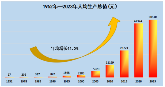 人均生产总值快速增长。新中国成立初,全县经济总量偏小,1952年全县人均GDP仅为27元,1978年人均水平236元,是1952年的8.7倍,年均增长8.7%。改革开放后,随着经济发展速度的加快,人均GDP大幅提升,1993年跃上千元台阶,达到1232元;1996年迈过2000元大关,达到2011元。进入二十一世纪,全县经济实现跨越发展,2005年人均GDP跨过5000元大关,达到5620元;2009年、2013年、2017年连续突破1万元、2万元、3万元大关,分别达到10049元、20275元、33538元;到2023年全县人均GDP达到50510元,较1952年增长1869.7倍,年均增长11.2%。