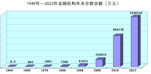 金融机构存款余额增势强劲。1949年全县金融机构各项存款余额仅有0.4万元,1950年4.9万元。改革开放后金融组织体系逐渐完善,存款规模迅速扩大,1978年存款余额达到1063万元,是1950年的217倍,年均增长21.2%。二十世纪90年代开始,随着国民经济的蓬勃发展,金融机构存款余额快速增长。1990年突破亿元达到11918万元;2005年突破10亿元达到115934万元;2008年突破20亿元达到224010万元;2010年突破30亿元达到364766万元;2011年突破40亿元达到422104万元;此后的2013年、2014年、2015年、2016年分别突破50亿元、60亿元、70亿元和80亿元。2023年金融机构存款余额达到1530318万元,与1949年相比年均增长22.7%。