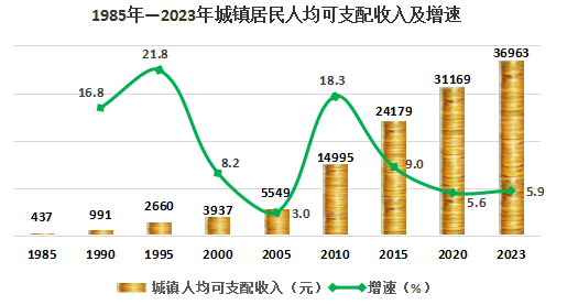2023年全县城镇居民人均可支配收入36963元,比1985年的437元增长83.6倍,年均增长12.4%。2023年城镇居民人均消费性支出23013元,是1985年445元的50.7倍,年均增长10.9%。