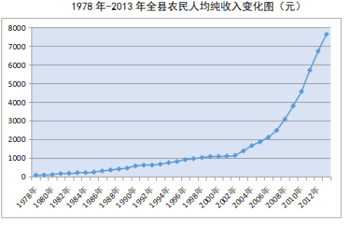 居民幸福指数全面上升。农民人均纯收入由1978年的73元增长到2013年的7644元,36年收入增加7571元,增长104 倍,年均增长14.2%。居民收入调查2014年城乡一体化改革,统计口径变化,同年,农村居民人均可支配收入为6940元,2023年达到16821元,年均增长10.3%。