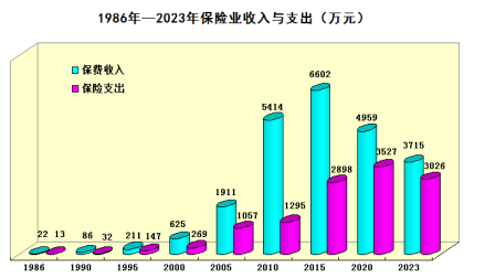 保险事业快速发展。1951年陇县成立保险支公司,1953年撤销,此后相当长时间内全县的保险业务由银行代办,直到1986年1月1日成立中国人民保险公司陇县支公司。当年实现保险业务收入22万元,其中财产险业务收入19万元,寿险业务收入3万元;全年保险业务支出13万元,其中财产险业务支出12万元,寿险业务支出1万元。2023年全县保险业务收入3715万元,比1986年增长167.9倍;其中财产险业务收入2569万元,寿险业务收入1146万元。保险业务支出3026万元,比1986年增长231.8倍;其中财产险业务支出2328万元,寿险业务支出698万元。