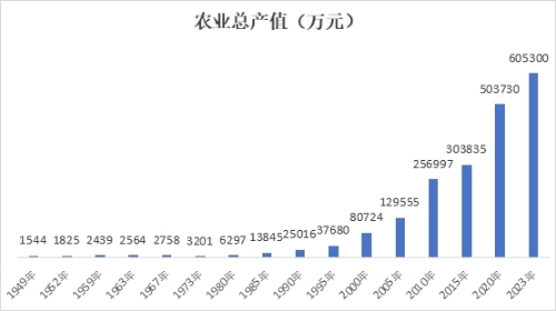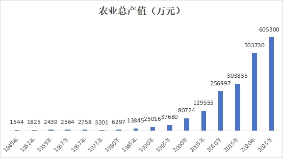 农业经济全面发展。75年来,农林牧渔业总产值从1949年的1544万元,增加到2023年的60.53亿元,增长392倍。1949年,粮食产量只有6.03万吨,1978年增长到13.14万吨。改革开放后实行家庭联产承包责任制,机械化生产手段不断推广,国家对农业的大力支持和农业科技进步使粮食产量进入增长期,1989年粮食总产量突破20万吨,2023年达29.35万吨。2023年猪、牛、羊年出栏已分别达到6.92万头、2.31万头、0.61万只,年产园林水果18.3万吨、蔬菜19.76万吨、生牛奶2.37万吨、禽蛋0.64万吨,农产品总量增加的同时,品种日益丰富,均衡供给能力不断增强。