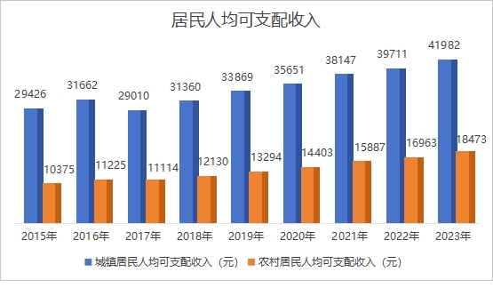 居民收入显著增长。凤翔区认真贯彻执行党和国家的各项方针政策,始终坚持把增加居民收入、改善人民生活作为工作的出发点和落脚点,城乡居民收入显著增长。新中国成立初期,凤翔人民生活经历了较长时期的困难。改革开放以来,居民收入显著增加,农民人均纯收入从1981年到1996年历经15年突破千元大关,至2007年用时11年突破三千元,至2013年用时6年突破一万元,达到10423元。自2008年城镇居民人均可支配收入纳入统计范畴以来,2015年农村居民人均可支配收入10375元,城镇居民人均可支配收入29426元。2023年,农村居民人均可支配收入达到18473元,城镇居民人均可支配收入实现41982元,城乡居民人均可支配收入之比由2015年的2.84下降为2023年的2.27。