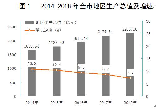 初步核算,全年实现地区生产总值2265.16亿元,比上年增长7.2%。其中,第一产业增加值163.39亿元,增长2.7%;第二产业增加值1434.07亿元,增长7.4%;第三产业增加值667.70亿元,增长8.2%。三次产业结构比为7.2:63.3:29.5。按常住人口计算,全市人均生产总值59988元,折合8741美元(汇率为1美元兑6.8632元人民币)。非公有制经济增加值1155.92亿元,占全市经济总量的比重为51.0%。