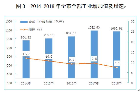 全年全部工业增加值1063.91亿元,比上年增长7.3%,其中规模以上工业增加值增长7.6%。