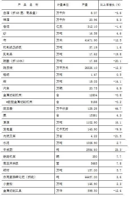 全市35个行业大类中,27个行业工业增加值比上年增长。其中:煤炭开采和洗选业工业增加值增长27.6%,汽车制造业增长18.3%,纺织业增长12.6%,非金属矿物制品业增长12.1%,通用设备制造业增长11.7%,有色金属冶炼与压延加工业增长11.0%,农副食品加工业增长8.2%,铁路、船舶、航空航天和其他运输设备制造业增长7.1%,烟草制品业增长6.6%。