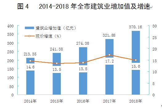 全年建筑业增加值370.16亿元,比上年增长15.0%(按现价计算)。年末全市具有资质等级的总承包、专业承包和劳务分包建筑企业164户,年平均从业人员12.88万人,增长14.0%。全年共签订合同额1002.96亿元,增长4.2%。全年完成建筑业总产值932.32亿元,增长12.2%。