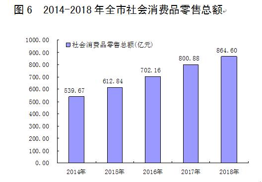 全年社会消费品零售总额864.60亿元,比上年增长10.4%。按销售单位所在地分,城镇消费品零售额783.23亿元,增长10.3%;乡村消费品零售额81.37亿元,增长11.3%。按消费形态分,商品零售额765.10亿元,增长9.8%;餐饮收入99.50亿元,增长14.7%。