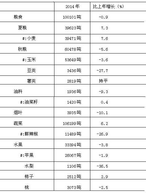 主要农产品产量有增有减。全年粮食播种面积49.02万亩,比上年减少1.86万亩,下降3.7%;粮食总产量达到10.01万吨,比上年减少0.09万吨,下降0.9%。烤烟种植面积4.01万亩,下降1.0%;烟叶产量3935吨,同比下降10.1%;实现产值7209万元,同比下降19.3%;税金1586万元,同比下降19.3%。
