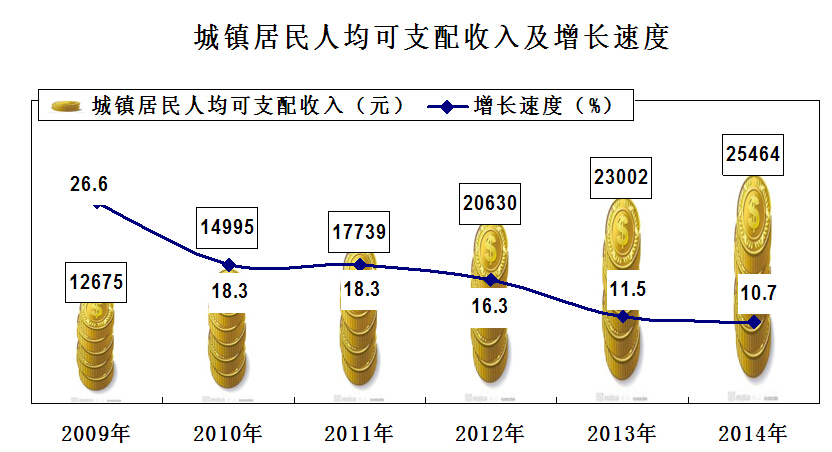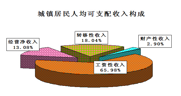 城镇居民人均可支配收入达到25464元,比上年增加2462元,增长10.7%;其中,工资性收入16801元,增长6.8%;家庭经营性收入3330元,增长25.5%;财产性收入739元,增长17.3%;转移性收入4594元,增长4.2%。城镇居民人均生活消费支出达到10312元,比上年增加1257元,增长13.9%。