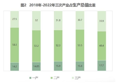 第一产业增加值占生产总值比重为17.7%,第二产业增加值占生产总值比重为48.4%,第三产业增加值占生产总值比重为33.9%。人均地区生产总值69402元。