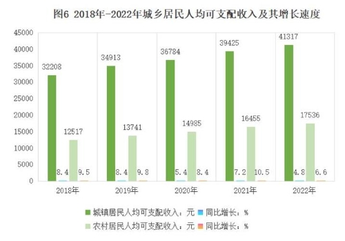 据城乡一体化住户调查,全年全体居民人均可支配收入25344元,比上年增长6.6%;城镇居民人均可支配收入41317元,比上年增长4.8%;农村居民人均可支配收入17536元,增长6.6%,高于城镇1.8个百分点。城乡居民收入差距继续缩小,人均可支配收入比(以农村居民收入为1)为2.36,比上年缩小0.04。