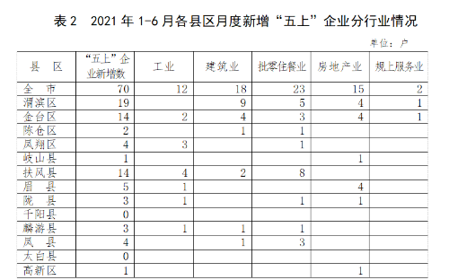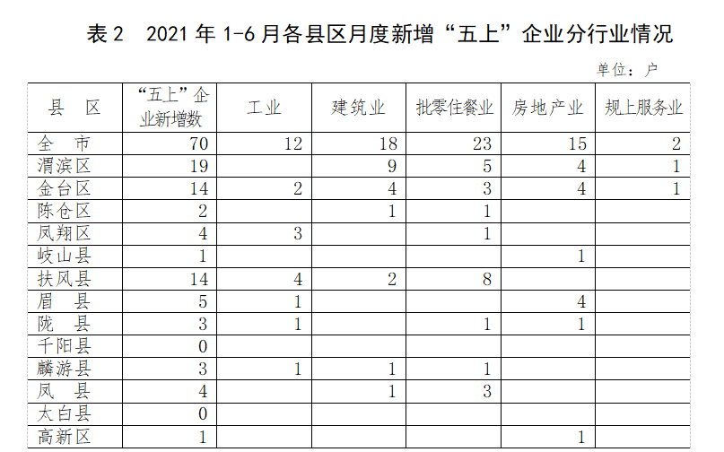 一是累计新增单位数居全省第三位。截至6月末,累计新增“五上”企业260户,累计新增单位数低于西安(1164户)、榆林(317户),位居全省第三。