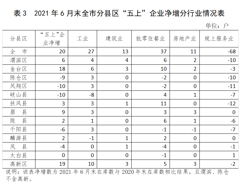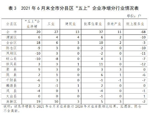 三是县区之间差距较大。截至6月末,全市“五上”企业在库数2661户,与2020年末“五上”企业数相比净增20户。其中高新区、金台区、眉县净增较多,分别净增19户、18户、9户;凤翔区、岐山县、陈仓区净增为负数,分别为-10户、-10户、-9户。(详见表3)