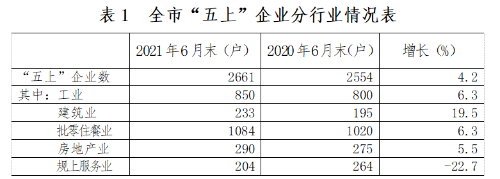 二是行业之间差异明显。分行业看,建筑业单位数增长较快,服务业单位数减少最多。至2021年6月末,全市规上工业企业为850户,较上年同期增长6.3%;建筑业企业为233户,较上年同期增长19.5%;批零住餐企业1084户,较上年同期增长6.3%;房地产企业为290户,较上年同期增长5.5%;服务业企业为204户,较上年同期下降22.7%,而申请退库的服务业企业中有94%的企业是由于服务业企业统计标准提高致使企业不达标而退库。(详见表1)